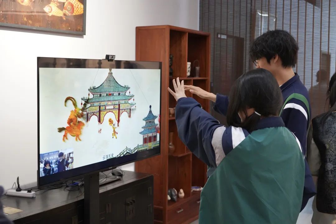 开幕式上,观众通过手机扫描展品,瞬间触发AR动画,生动的卡通敦煌飞上了天空,在纸上跳跃。展览特别作品手势互动皮影“牵丝千机影”,用数字电视投射互动手势,让观众在指尖互动体验皮影技巧。