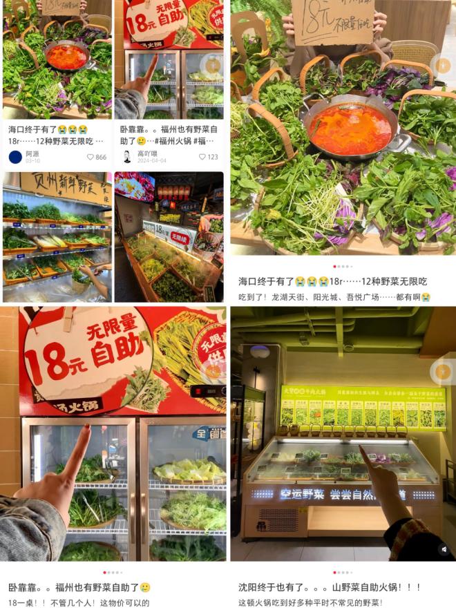 从小红书的笔记中,我们发现很多地方,比如南宁、厦门、贵阳,也有价格。 18 元、12 不同价位的野菜自助火锅,如元,柜台上陈列着各式各样的野菜,给人一种尽情的吃法。 “草” 的阵仗。
