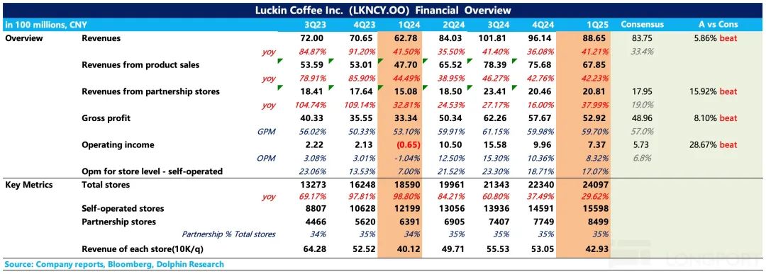 在北京时间,瑞幸 2025 年 4 月 29 日晚,美股盘前发布。 2025 第一季度财务报告。总的来说,Q1 表现还不错。高于 BBG 期望,但卖方没有覆盖瑞幸,所以这一期望只能简单参考。