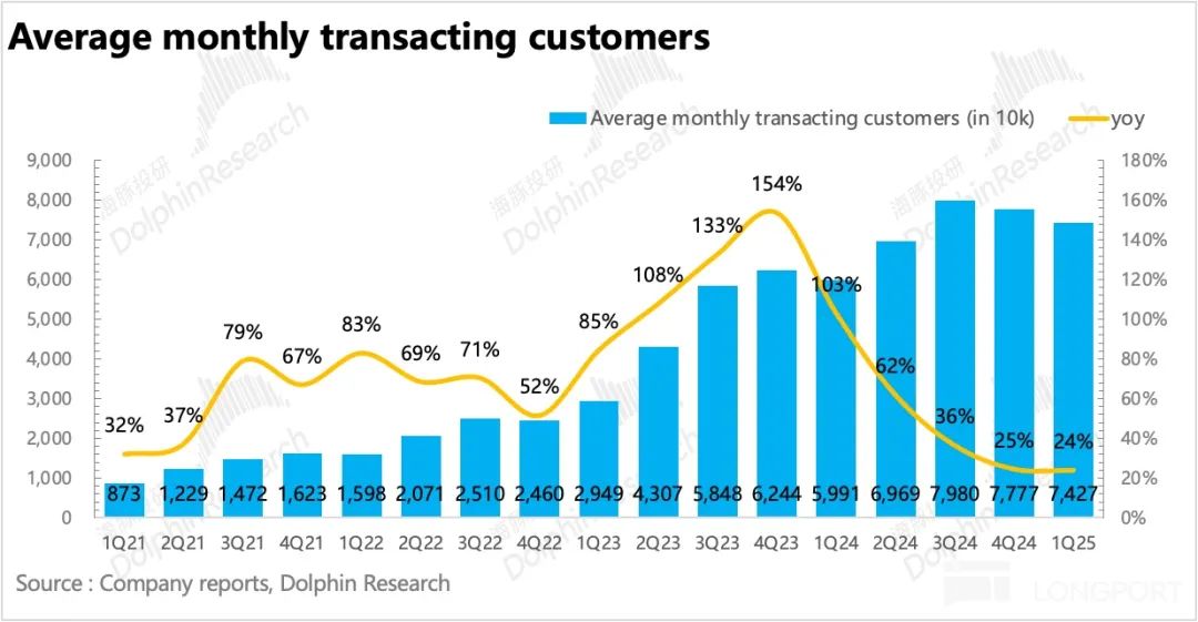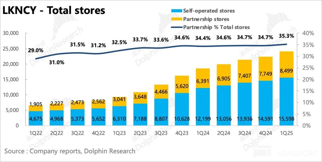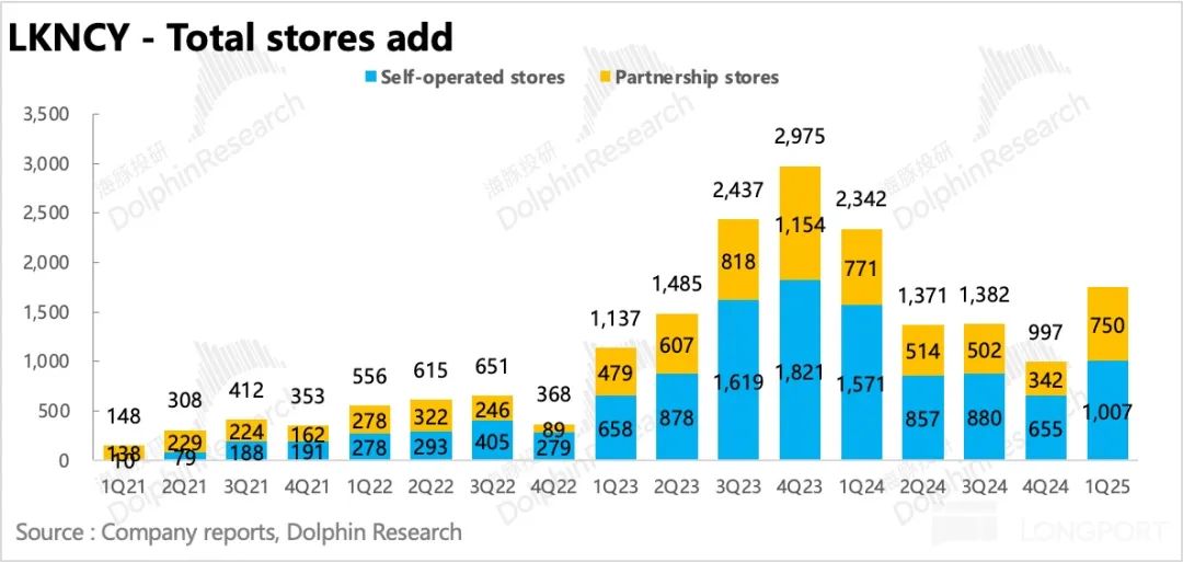 就开店数量而言,瑞幸 25Q1 环比 24Q4 净新增 1757 家庭商店,其中自营商店/加盟商各自净新增。 1007 家/750 与管理层给出的年度开店目标相比,家庭(4000-500000 家里),第一季度这种开店节奏按照原来的指导目标,实际上有点超出预期。