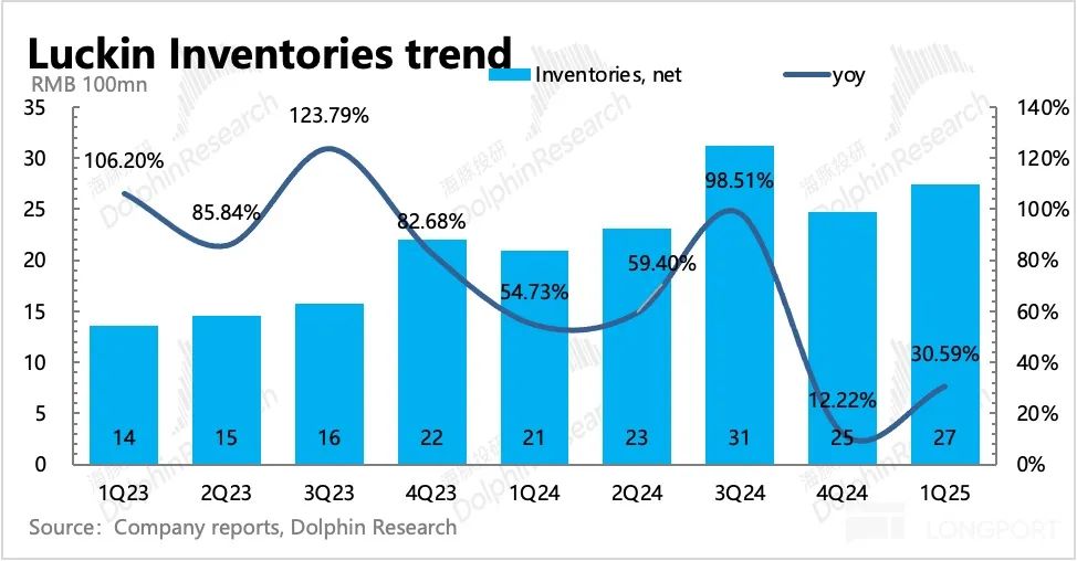 拆解方面,产品毛利率稳定(环比仅下降) 0.3%),咖啡豆的飙升似乎对瑞幸的影响有限。与瑞幸一样,这可能会选择大规模直接采购。 长期合同锁定成本的方式可以控制或降低短期原材料成本的变化。目前瑞幸库存稳定,第一季度同比增长,长期合同以外的临时采购需求估计不高。