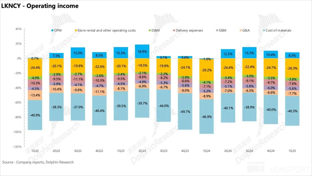 在淡季餐饮的前提下,一般利润率会相对压力,尤其是对于还处于开店周期的瑞幸来说。但第一季度,瑞幸的利润率相对较强,环比下降幅度不大,无论是从集团还是直营店的角度。