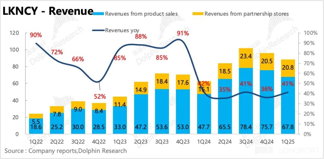 Q4 瑞幸实现了总收入 88.7 亿元,同比增长 41%,超过 BBG 预期的 83 亿,但一般买家的资金预期本身就会更加乐观。从拆分业务的角度来看,自营店的收益 68 亿,依然在 42% 在高速增长中;加盟业务收入 21 亿,也实现了低基数下的亿, 38% 的高增长。