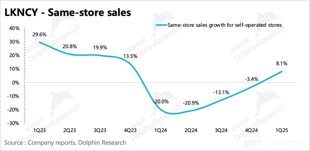 1、同店增速如期转正:第一季度,同店销售增长率回归 8% 正增长。虽然有低基数的原因,但海豚君在最近两个季度的评论中也提到,库迪的竞争并不可怕,通过定量和定性的跟踪变化来判断。因此,同店增速回到预期,预示着瑞幸正式走出竞争泥潭。
