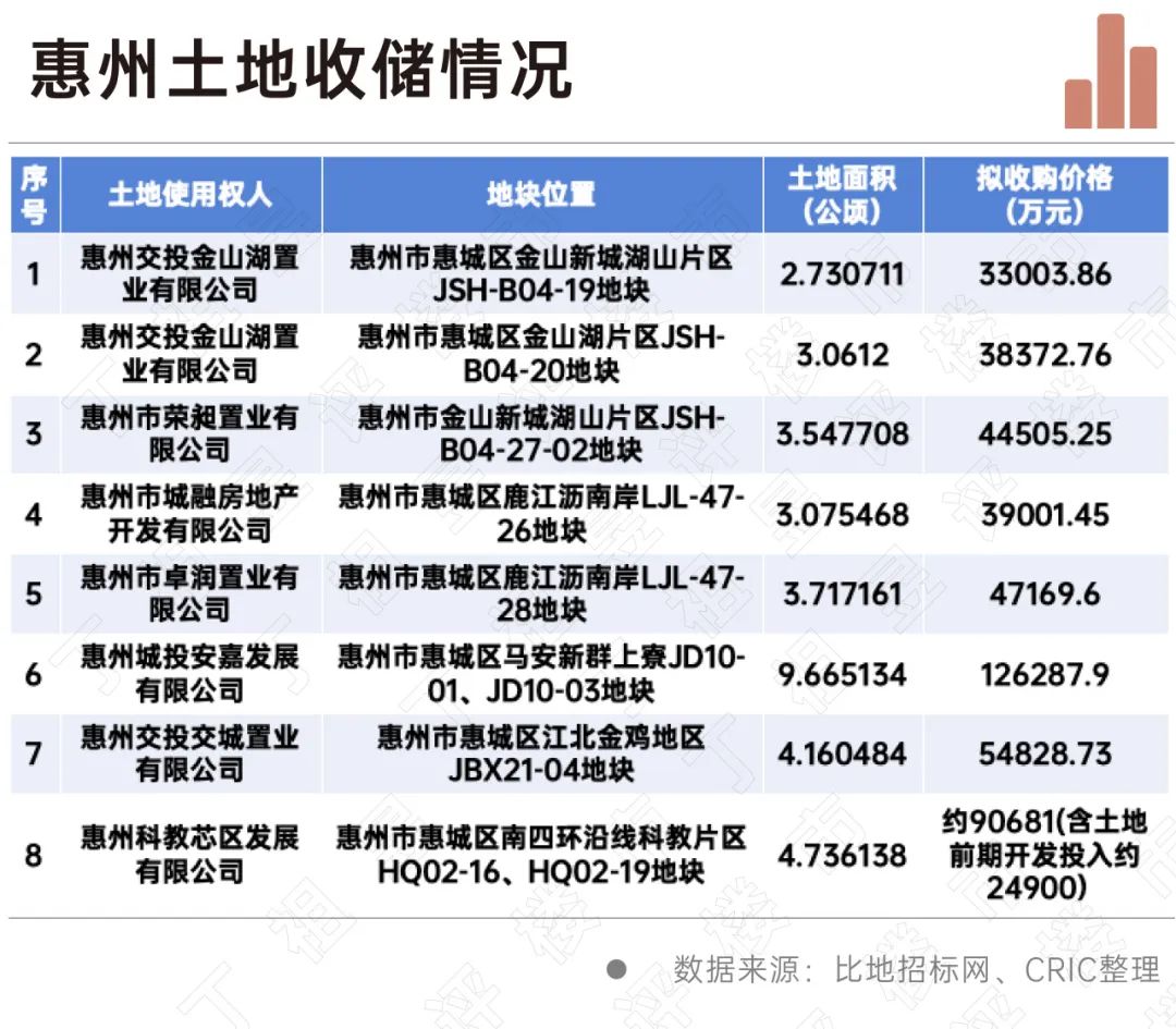 从土地收集和储存的目标来看,大部分主要是地方国有企业,尤其是城市投资和平台公司。以惠州为例,2025年2月10日,惠州市自然资源局公布了一批拟收购的国有建设用地使用权明细,共有8块地块。从其土地使用权人的角度来看,都是城市投资平台公司。