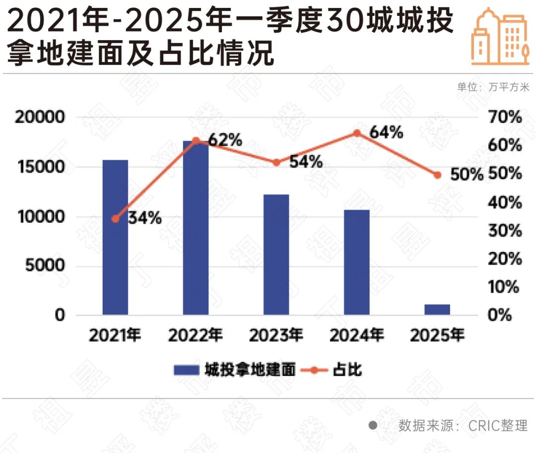 CRIC数据显示,2023年城投征地建设面积12278万平方米(包括住宅地块在30个重点城市的统计口径相同)同比下降30%,2024年规模进一步萎缩,同比下降13%,如果比2022年高点下降40%以上。
