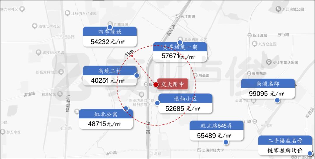 但是仔细研究就会发现,上海中学旁边的一些社区属于“上海小学” 徐汇区教育学院附属实验中学的双学区。而不是好学区的社区价格没有优势。最终,公共义务教育阶段的学校将提高社区的房价。交通大学附属中学周边没有高质量的公立初中,可以更好地反映高中对房价的影响。