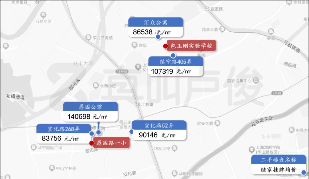 愚园路一小段对口小区,即使是老破小区,价格也在10万元/万元。㎡而且包玉刚实验中学周边的老小区很难卖到10万//㎡上述。这类社区的业主与走国际路线的学生家长并非同一个客户群体,也难以促进周边房价的上涨。