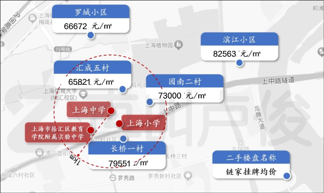 在高中方面,我们选择了上海中学和交通大学附属中学作为样本(两者都是上海四大名校),了解链家的上市价格。结果表明,上海中学附近的社区价格普遍高于同一个板块的同类型房地产。