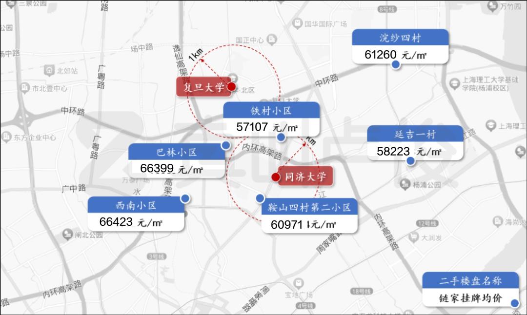买在一边对入学影响不大。如果你想上一所名校,你必须依靠鸡宝宝。我们还看了复旦大学(邯郸校区)和同济大学(四平路校区)所在的中原板块和旁边的曲阳板块。