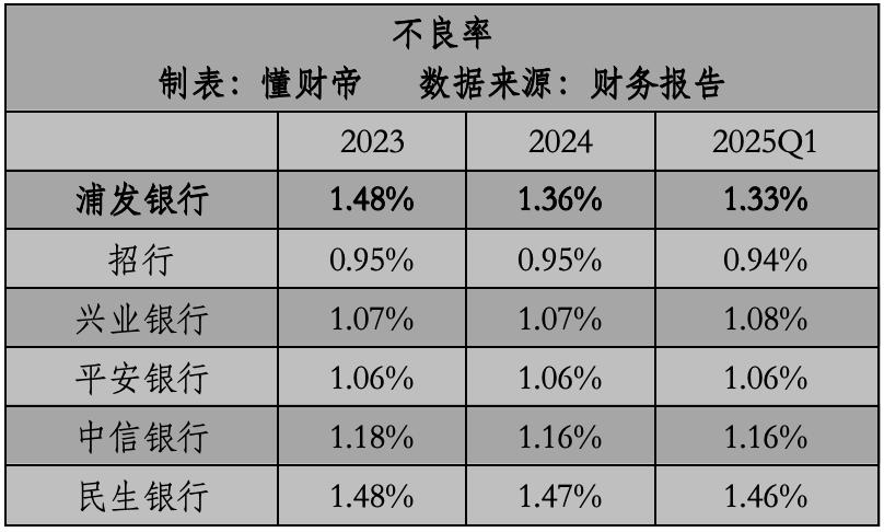 2024年不良率为1.36%,2025年不良率为1.33%。,仍远高于招商银行、兴业银行、平安银行、中信银行,但减幅较大。