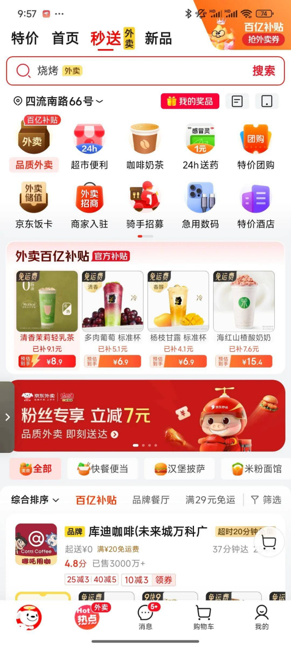 在全民补贴方面,JD.COM外卖向全体客户发放补贴,最高可达20元,覆盖平台所有餐厅。很多餐饮大牌,比如肯德基、海底捞、汉堡王、霸王茶姬、奈雪的茶、库迪、古茶,都可以用这个补贴。