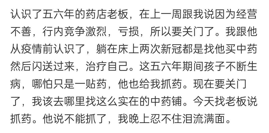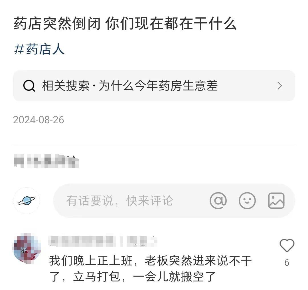 有人提到,认识五六年的药店老板,上周无奈地告诉他,由于经营不善,行业竞争激烈,亏损严重,只能关门。