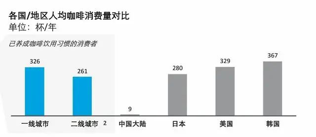 国内一二线城市中国人均咖啡杯量已达到 2~300杯/年,接近欧美、日本、韩国的发达地区,但下沉市场的潜在咖啡群体还是很多的,所以中国大陆的人均咖啡杯量不到9杯/年。与一线城市或欧美、日本、韩国的水平相比,还有几十倍的增量空间。然而, 培养下沉市场需要时间。