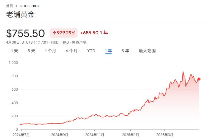 去年6月28日,港股上市公司老铺黄金上市,股价从40.5港元一路飙升至868港元,股价上涨近18倍。市值也从上市当天的118亿港元一路飙升至1460亿港元(今年4月1日),市值增长18倍以上,成为港股市场的明星股之一。与同样暴涨的泡泡玛特和蜜雪冰城一样,它被称为“港股三姐妹”。