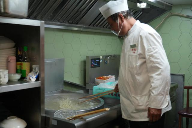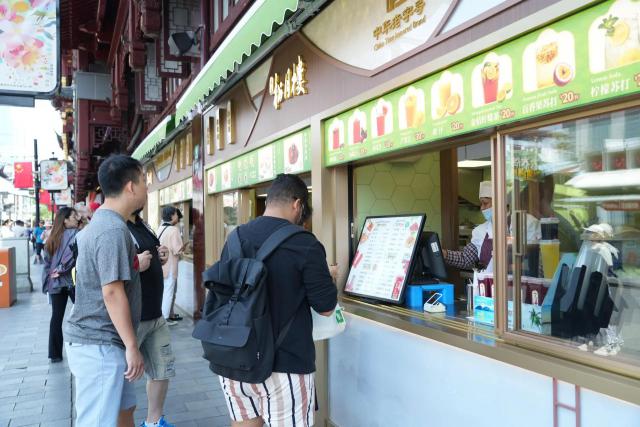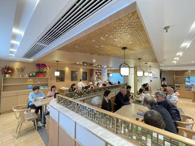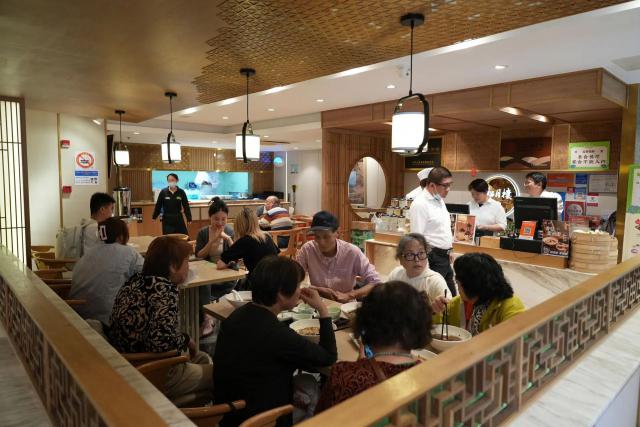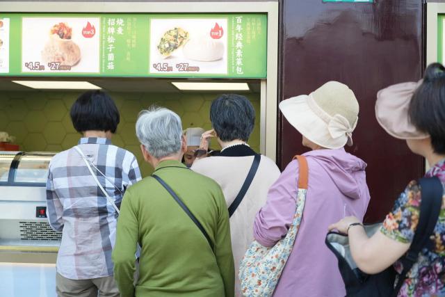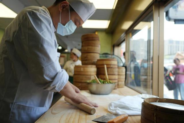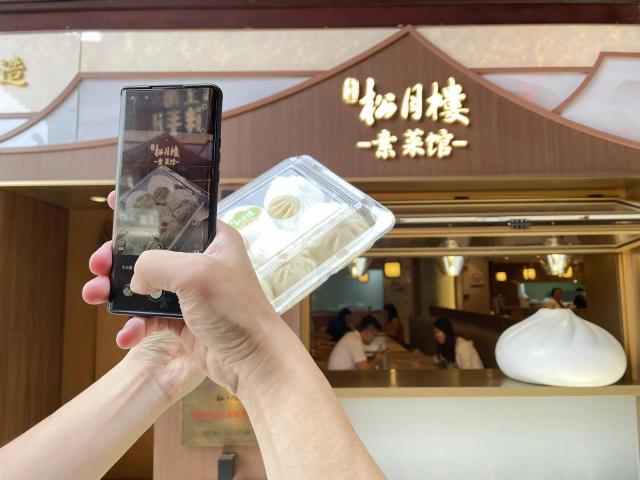走进新店,扑面而来的是浓浓的东方生活美学气息,简约大气的装修风格,让人眼前一亮。入口处的吧台和新设的包子景观,迅速成为新的打卡点,吸引了中外游客驻足拍照。临街外卖区增加了一个非遗展示窗口,将净素菜包的制作过程毫无保留地展现在大家面前,每一步都清晰可见。“从包子的下剂,擀皮,挑馅到包捏,特别是 22 褶皱工艺,都体现了松月楼的匠心,让顾客感受到百年工艺的温度。为了传承这种文化,我们向大家展示了这些工艺。"在采访中,松月楼运营区管理人员刘红奎说。它不仅是对传统技艺的展示,也是对百年文化的深厚保护和传承。