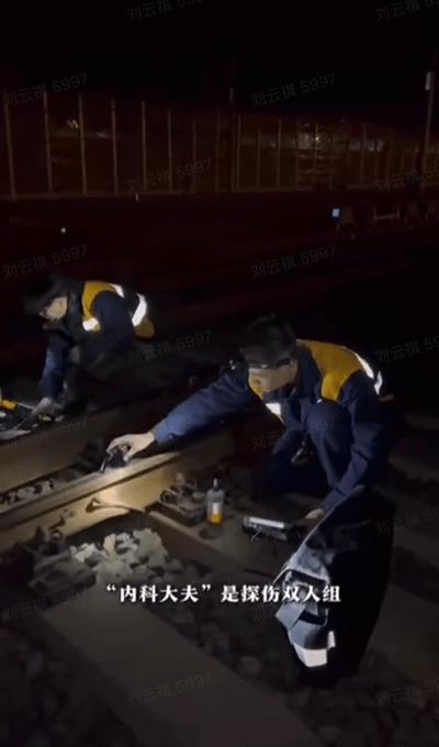 同样在黑暗中与时间赛跑的,还有铁路修理工大家。 @在一个瓜子的记录镜头下,“铁路上的外科医生”躺在地上观察轨道的平面度,有些人用仪器为轨道启动“心电图”。他们在以每小时的速度 350 高速铁路上稳定舒适的真相。