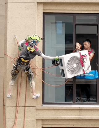 我看到的专业工作越多,就越觉得生活中平凡的一天来之不易。五月天气越来越热,全国各地都比平时更需要空调。也许你我都知道空调安装维修这个职业的出现,但是如果你不站在挂在楼内壁高空作业的“蜘蛛人”的角度,你就看不到一个城市的真实全貌。