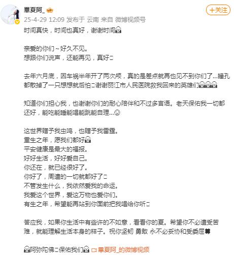 快科技 5 月 1 日消息,近日,《中国好歌》选手毕夏发消息称,“去年6月底,车祸半年开了两次颅,真的差点再也见不到你了……眼瞳散了一只眼睛,一想起来就害怕。知道你担心我,谢谢你的耐心陪伴和多言。上帝保佑我一切都很好。我可以吃饭、睡觉、唱歌、跳舞和照顾自己……”