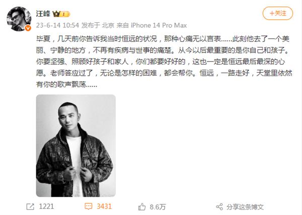 在张恒远去世后,汪峰曾发文悼念,并向张恒远的妻子毕夏表示安慰,并承诺帮助她。