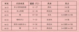 5月3日~四日:全市阴雨绵绵,有5天。~6级西北风,最低气温4级~12℃,最高温度19℃。~29℃。