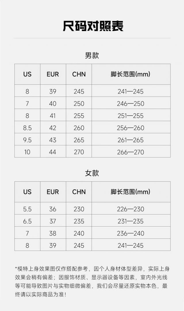 35-44 尺寸!男女款,不分年龄,全家都可以穿! ( 注意:建议根据日常运动鞋的大小来选择,宽脚的顾客可以酌情选择大一码。 )