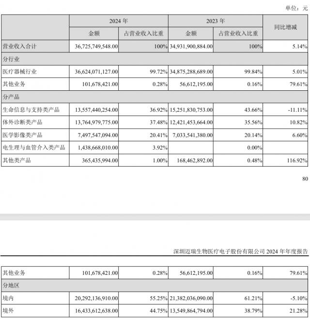 就业务而言,2024 2008年,迈瑞医疗体外诊断业务收入 137.65 亿元,同比增长 10.82%;支持业务收入的生命信息和生命信息 135.57 同比减少1亿元 11.11%;医学影像业务收入 74.98 亿元,同比增长 6.6%。