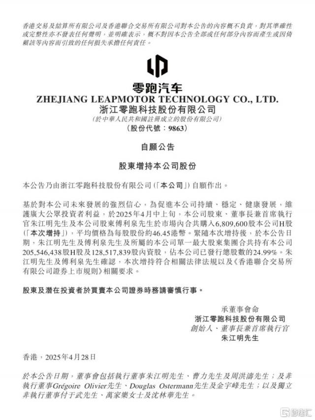 此外,公司创始人兼兼 CEO 今年朱江明和一致行动人傅利泉 4 每月也在不断加持公司股权,用真金白银表达对公司前景的坚定信念。根据零跑 4 月 28 2025年晚上公布的公告统计 年 4 上述股东在月中上旬加持超持。 680 万股,额度超过 3 亿港币。值得注意的是,这一加持是去年的事。 3 在亿港币加持的基础上再次加持。