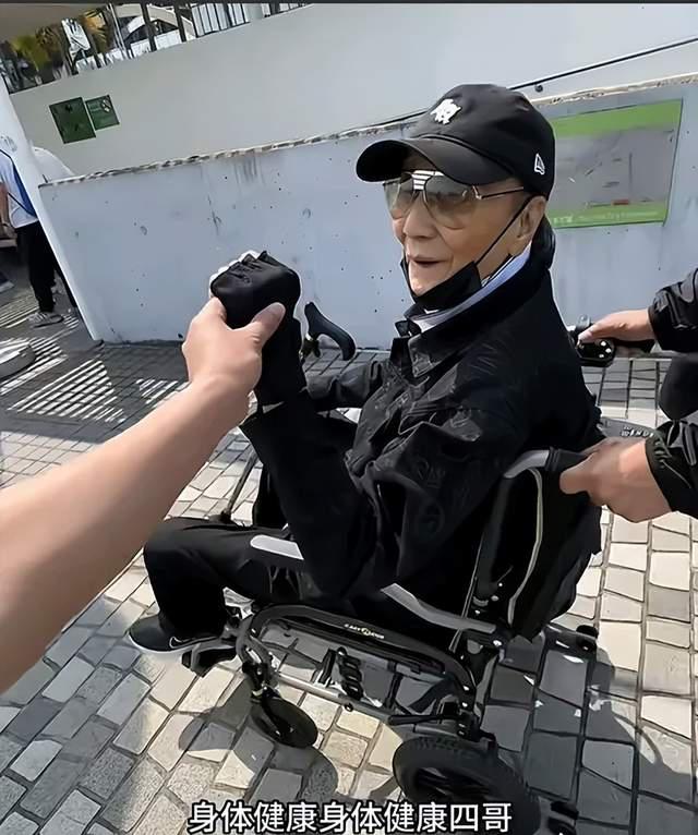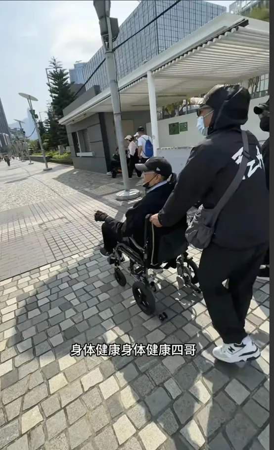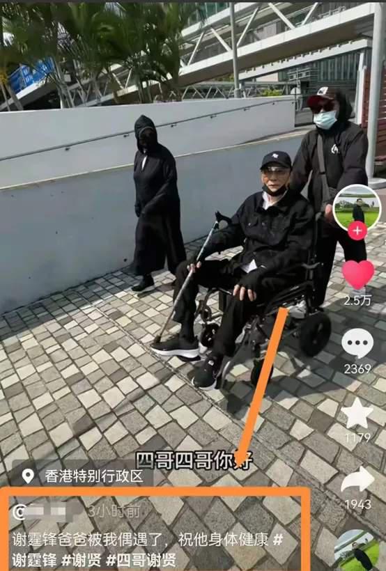 视频中,谢贤坐在轮椅上,由保姆拉着。他戴着墨镜、棒球帽、口罩和手套,手里拿着拐杖。总之,谢贤的搭配是黑色的,衣服有点厚,怕冷。