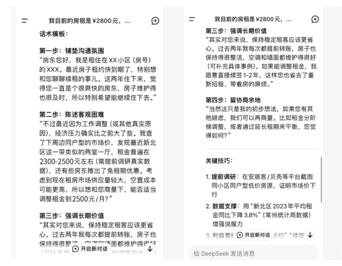 不知如何开口讨价还价,没关系,直接向Depseek求助,得到一套完整的“讨价还价”。:首先给房东戴上高帽子,满足他们的情感需求,然后用市场数据说话,防止主观讨价还价,适度示弱,但卖得太惨。最后强调长期稳定收益,“留台阶”,防止谈判僵局。