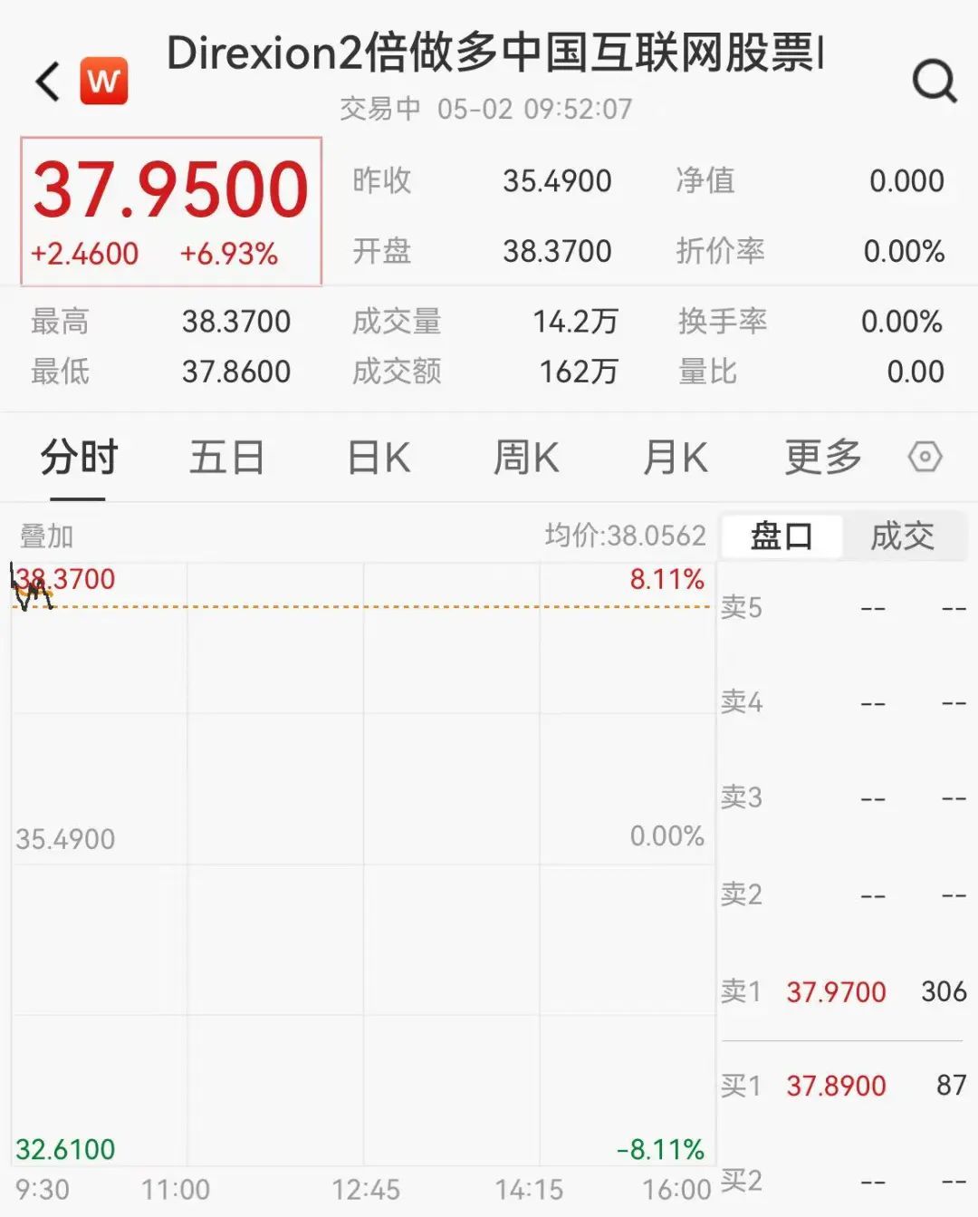 另外,中国ETF每天涨幅超过8%,中国互联网股票ETF每天涨幅超过6%。
