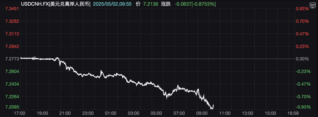 晚上,中国资产继续上涨。首先,离岸人民币对美元的汇率。港股收盘后,离岸人民币对美元的汇率继续扩大。截至发稿,当天涨幅已超过600个基点,盘中一度超过7.21个关口。