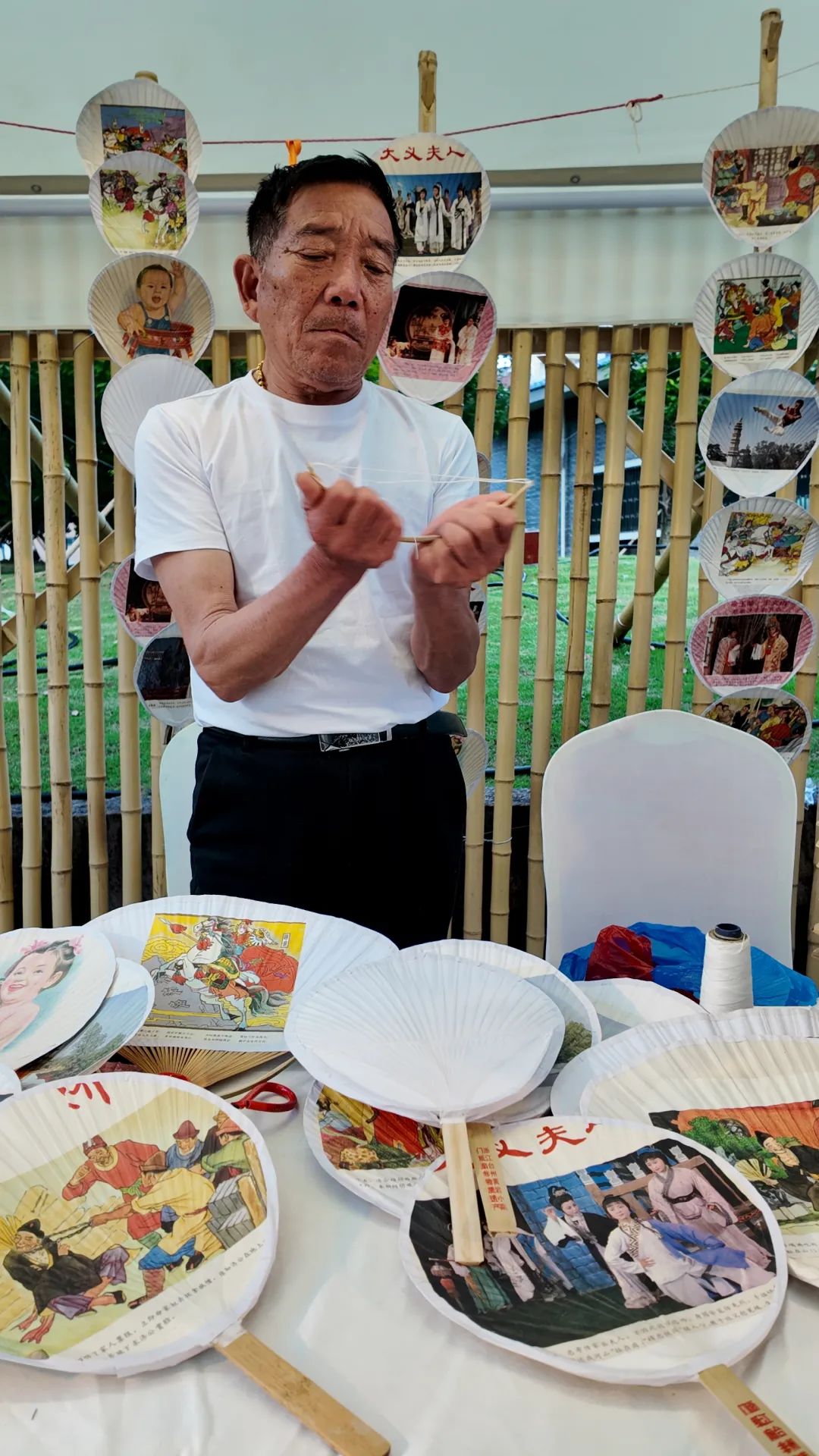 市场上,翻簧竹雕工匠手持雕刻刀,指尖翻飞;小南门纸扇上的旧贴纸诉说着老故事;火烧铁笔在木板上游走,烙上可爱的石矶娘娘...