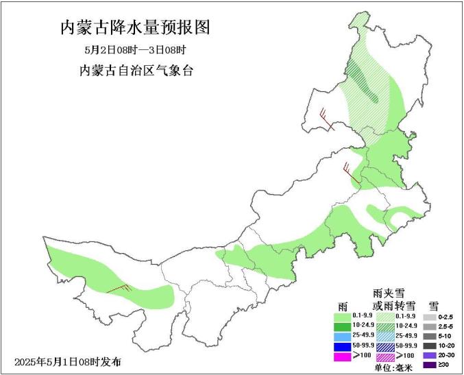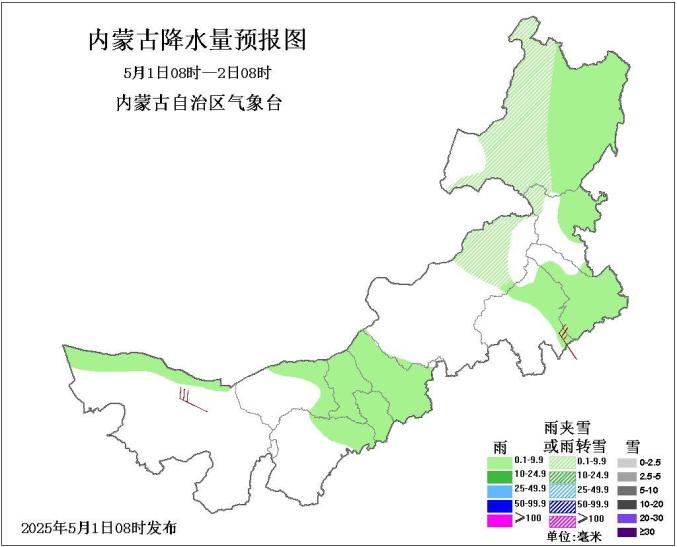 1日08时至2日08时,全区大部分地区多云间晴,阿拉善盟北北部、巴彦淖尔市东部、鄂尔多斯市东北部、包头市、呼和浩特市、乌兰察布市、锡林郭勒盟东北部、赤峰市东部、通辽市中南部、兴安盟西北部和东部、呼伦贝尔市大部分地区都有小雨或雨夹雪;西部大部分地区,中部东部和东部南部。、5级短时6、7级局地8级西北风或偏北风,西部偏西地区有沙尘天气;西部偏西地区气温下降6至8℃,局部气温下降8℃以上。