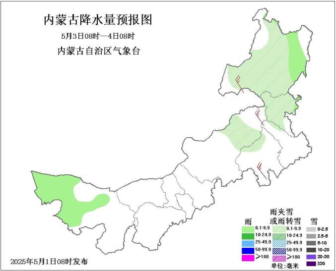 3日08时至4日08时,西部西部、中部东部和东部大部分地区多云晴朗。阿拉善盟西部、锡林郭勒盟东部、赤峰市北部、兴安盟大部分地区、呼伦贝尔市大部分地区都有小雨或雨夹雪,其他地区晴空多云;中间大部分地区、东南部地区和东北部西部地区、5级短时6、7级局地8、9级西北风。