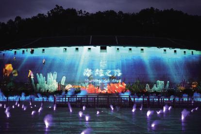 中国市华北院项目团队负责“二宜楼”裸眼3D灯光秀的设计。从整体艺术美的角度来看,突出了二宜楼的建筑空间布局、木雕、对联、壁画等特点。,充分考虑建筑保护,选择投影方式,运用视觉艺术手法,完全按照土楼的建筑造型进行创造,达到超现实的视觉效果;积极运用新技术、新材料,特别是高科技,提高灯光秀的科技与互动,使历史文化融入当前市民生活,使人们从中感受到二宜楼的文化,保护二宜楼的历史。