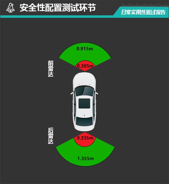 最远的前雷达可以在那里 0.915m 处处感应前方物体,雷达功率表现一般;持续蜂鸣提醒距离为 0.305m,性能也没有达到同级别车型的平均水平。