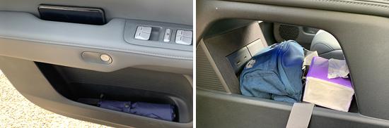 对车内使用空间的检测,仅针对前排触手可及的空间,不包括手套箱、中央扶手箱等需要启动的空间。测试方法是将以下所有固定物品放置在前排的每一个储物空间中,通过固定物品的放置状态来判断车辆储物空间的性能。检验选定的固定物体如下:2 一瓶常规大小的矿泉水, 大屏幕手机,1 支口红、1 个挎包、1 副墨镜、1 把折叠伞和 1 包装常规尺寸的抽纸。