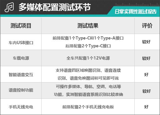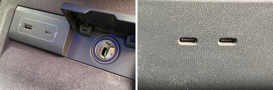 评测车配置 1 个 USB Type-A 接口和 3 个 USB Type-C,接口兼容性好。其中,前排 1 个 USB Type-A 接口和 1 个 USB Type-C 接口,位于中控台下;后排; 2 个 USB Type-C 接口位于空调风口下方。另外,前排中控台下方还提供 1 个 12V 电源接口,能满足车内乘客多种电子产品的用电需求。