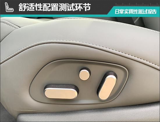 在座椅方面,评估车主驾驶座电动调节按钮位于座椅侧面,调节按钮位置合理。此外,评估车前座椅支持记忆功能,并提供加热、通风和按摩功能;后座提供加热功能;同时,驾驶座还配备了头枕扬声器,舒适性配置更好。