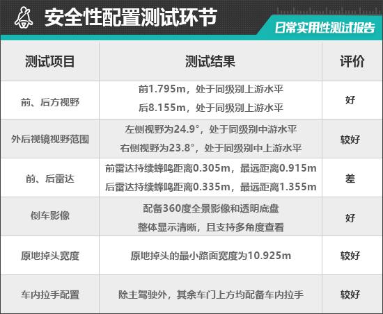 在汽车前后视线检测中,车内所有座椅均已调整到最低状态,检测到的数据与驾驶员正常使用时存在一些误差,仅供参考。