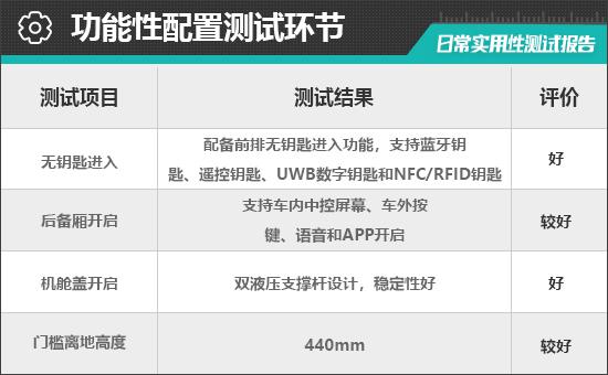 对消费者而言,门槛离地高度在一定程度上决定了上下车的便利性。根据实际测量结果,对汽车门槛离地高度的评估 440mm,达到同级别车型的平均水平,驾驶员每天上下车比较方便。
