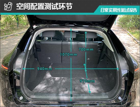 后备箱内部形状整齐,地板平面度好。后排座椅的支撑比例放下,放下后可以进一步扩大后备箱空间。我们还实际测量了汽车后备箱的基本值,开口长度为 1070mm;张口宽度为 940mm;后备箱进入深度 970mm;后备箱台与上面的垂直高度为 700mm。