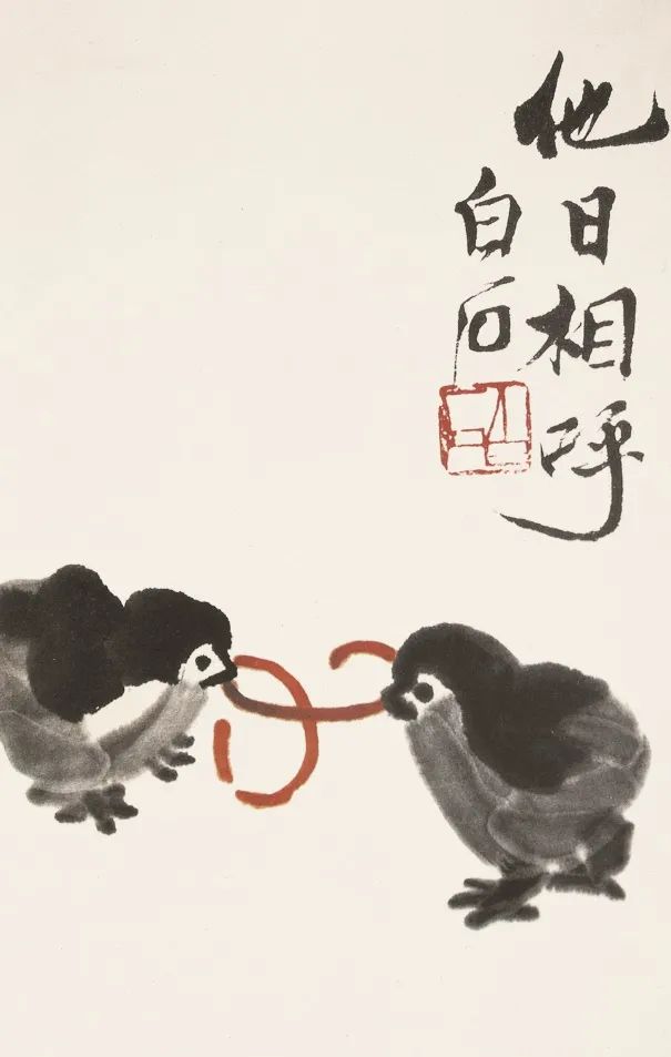 齐白石的《另一天的呼唤》一页,纸上有颜色,北京荣宝斋藏韩羽的《读齐白石》记载:再看,两只鸡互相争一只虫子,只是因为写了四个字“来日呼唤”,马上就一帆风顺了,从目前因为吃饭而“互相争斗”,想象着过去的“呼唤”而相亲,却看到了眼前的“利润”,忘记了过去的“义”。