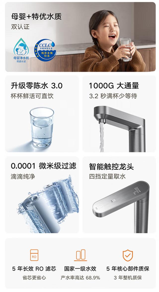 商品页面显示,这款新产品 PPC RO 与水中杂质、余氯、重金属、细菌等密切合作,镉去除率大于 铅去除率大于99.8% 大肠杆菌去除率99.9% 100%。获得母婴级净水器认证,严格使用无双酚 A 测试;通过近百项严格的水质测试,获得特优水质认证。