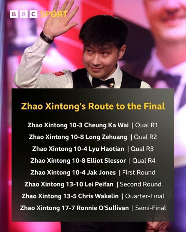 赵心童连胜 8 球场,一路进入决赛,距离冠军只有一步之遥。在决赛中,赵心童将面对马克克。 - 威廉姆斯和特鲁姆普之间的胜利者。