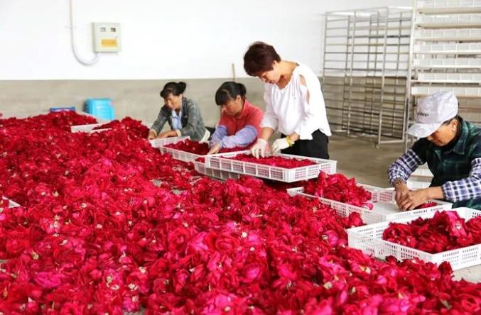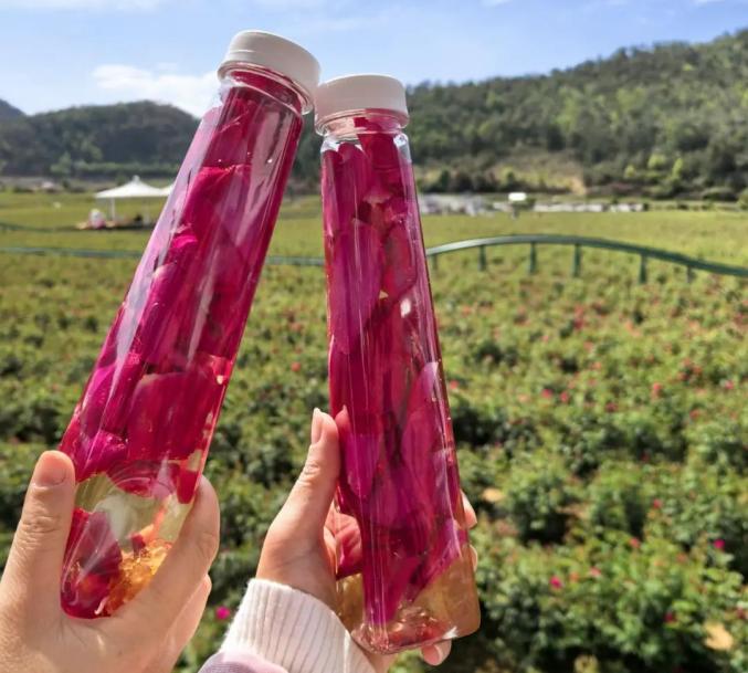 当游客走进花房时,他们可以在花海中拍照打卡,感受花饼的制作,品尝玫瑰冰淇淋、凉米粉等特色美食,享受舌尖和视觉的多重浪漫。当黄昏时,玫瑰披着金纱,山风带来了远处作坊的笑声和欢笑。