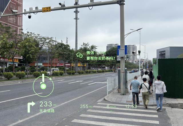当然,StarV Air2 的「溢光」情况也与眼镜显示的亮度有关:StarV Air2 采用单色光波导方案,显示亮度极高,在 20% 在亮度的情况下,还可以保证户外阳光下的阅读。小雷特周末带着它 StarV Air2 感受到石门森林公园的山路 AR 导航-不管是右上角的微信通知,还是下面的地图信息,都不会因为中午太阳太阳而看不清楚。