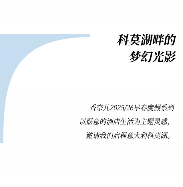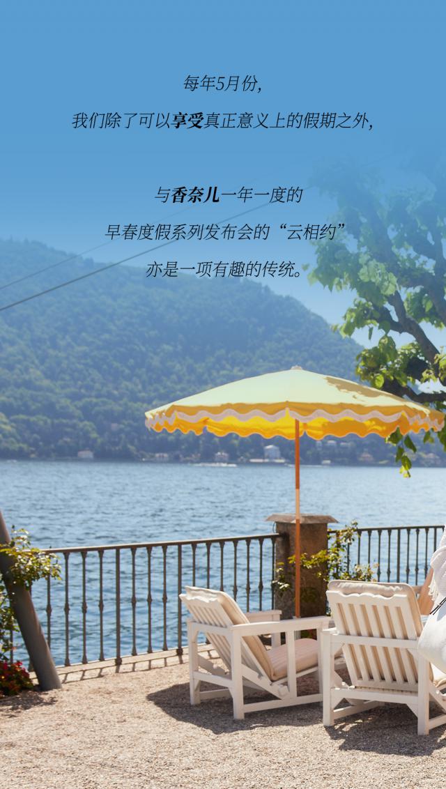 嘉柏丽尔 · 香奈儿女士的朋友,科莫湖的常客——著名导演卢基诺 · 维斯康蒂的电影世界似乎就在眼前。他导演的电影《Boccaccio 七十中,著名演员罗密 · 施耐德演绎的经典香奈儿造型,也成为本次初春度假系列的一部分灵感。