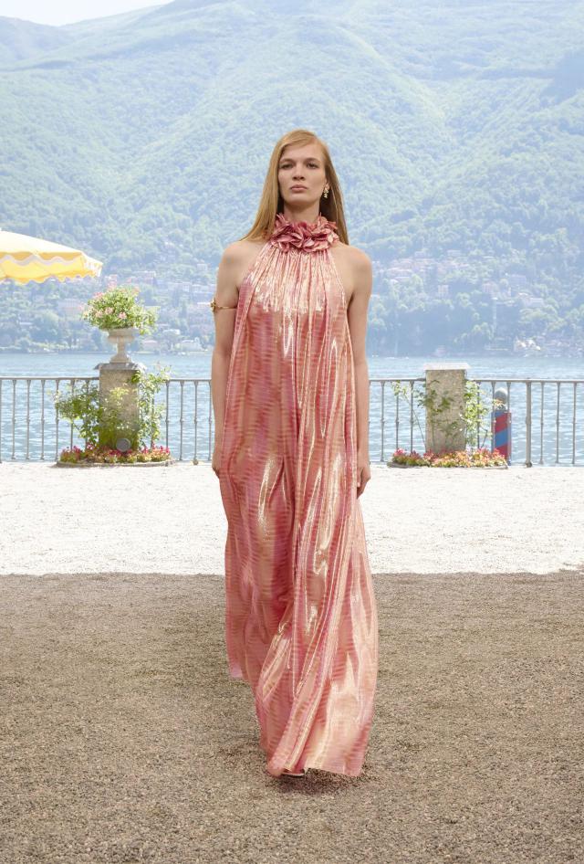 气氛愉快的短荷叶边塔夫绸连衣裙,以桃色、粉色、蓝色等粉色调呼应科莫湖畔华丽的风景。经典的斜纹软呢套装色彩鲜艳,与埃斯特庄园建筑的赭色、黄色、橙色相得益彰。
